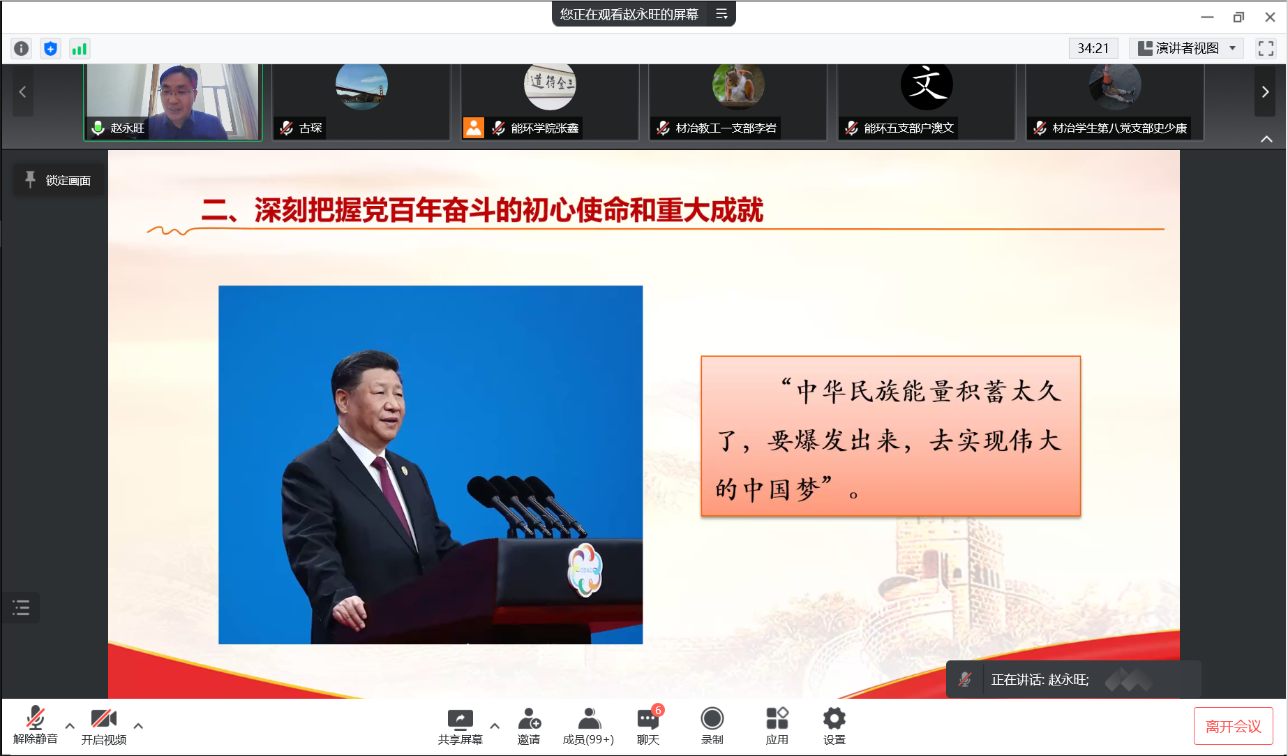 赵永旺部长指出,我们要全面贯彻习近平新时代中国特色社会主义思想,大力弘扬伟大建党精神,勿忘昨天的苦难辉煌,无愧今天的使命担当,不负明天的伟大梦想,以史为鉴、开创未来,埋头苦干、勇毅前行,为实现第二个百年奋斗目标、实现中华民族伟大复兴的中国梦而不懈奋斗。