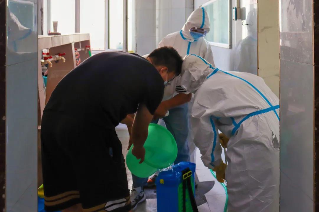 消杀现场,消毒人员“全副武装”、身着防护服、背着药壶、严格按照操作规范穿梭在宿舍各楼层、过道、卫生间,对触摸较多的公共场所进行了全方位消杀,做到不留死角,全面彻底。
