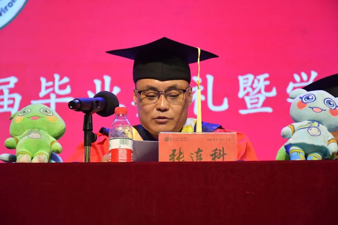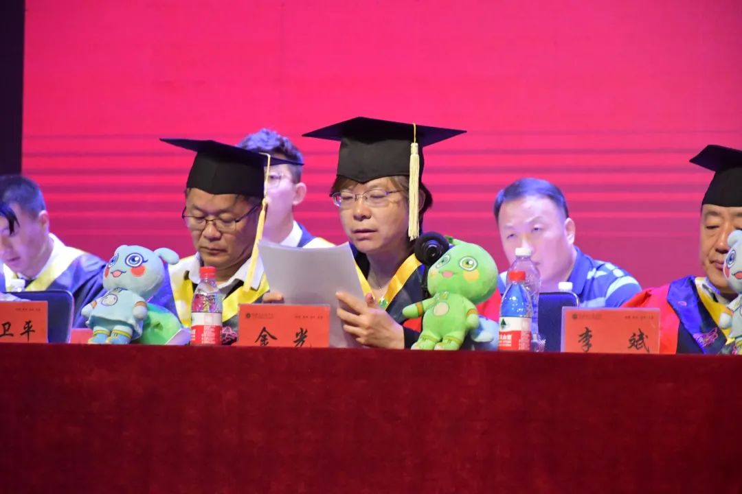 教师代表何丽娟为同学们送上毕业祝福。她希望毕业生们可以仰望星空,脚踏实地,追着光奔跑,活成自己最喜欢的样子,不负梦想,未来可期。