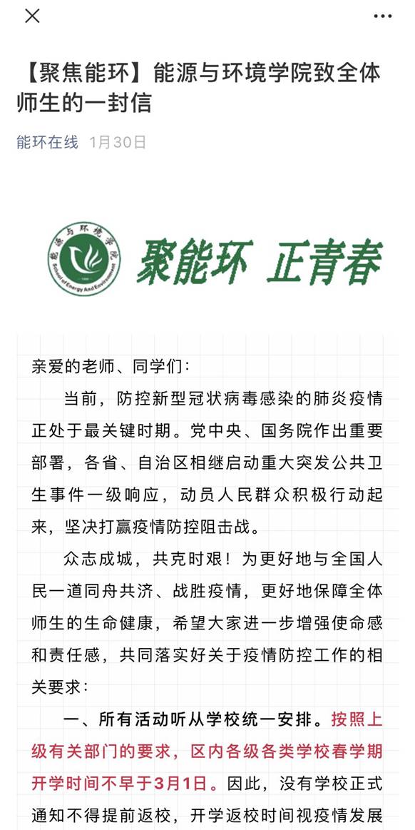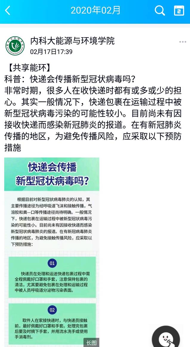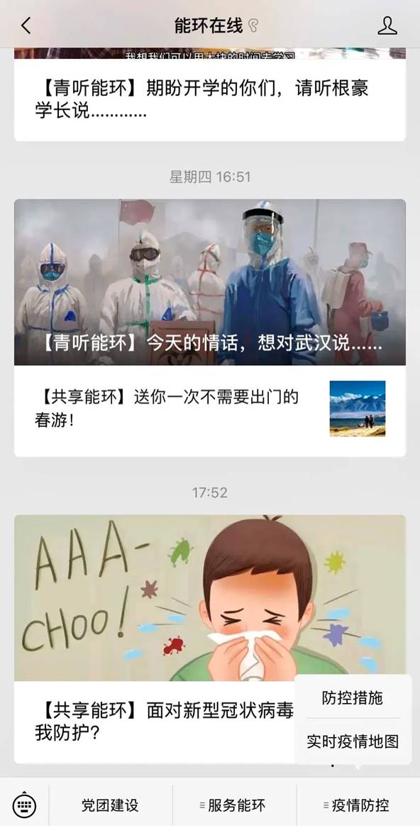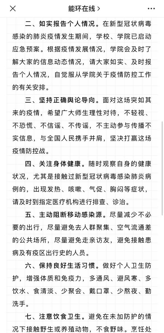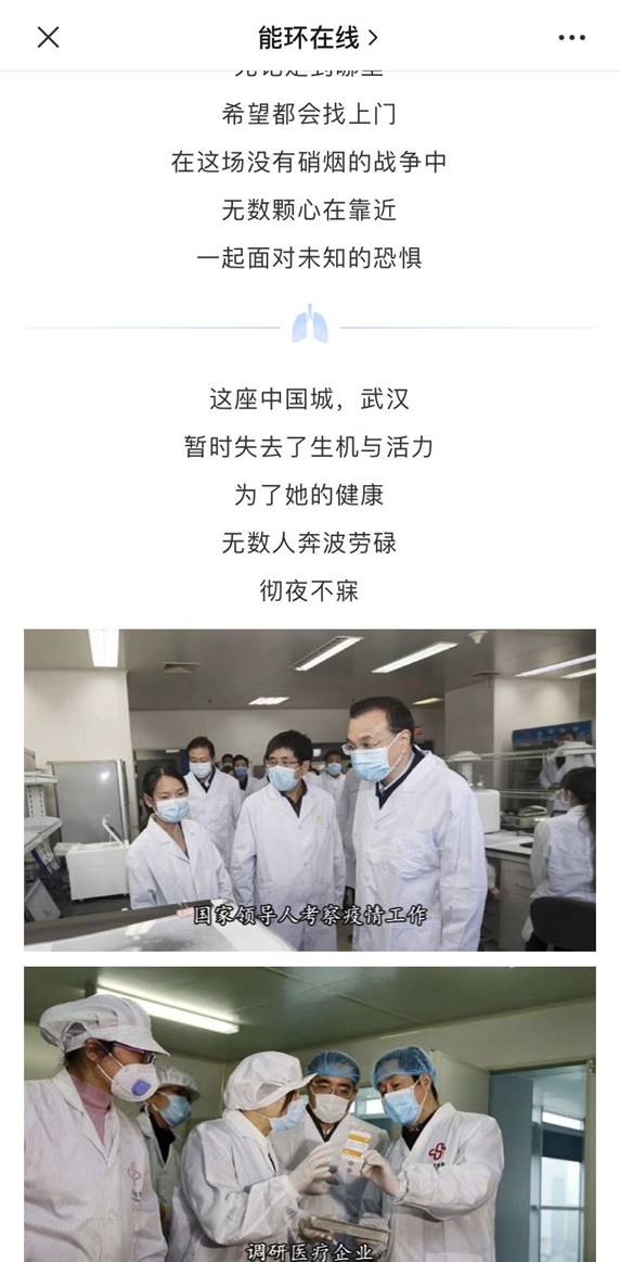 公司充分发挥新媒体信息联动、共享优势,全媒体、多平台、多渠道开展疫情防控宣传。通过公司网站、微信公众号、微博、QQ空间、抖音平台等多种方式、多种渠道积极传递正能量,密集推送宣传疫情防护知识、最新疫情消息及公司疫情防疫公告。与此同时,公司在微信公众号《能环在线》中开设 “疫情防控”专栏,发布防控公告、防控手册、防控提示,引导公司师生做好自我防护,科学理性认识疫情,不信谣、不传谣,养成文明健康生活方式。
