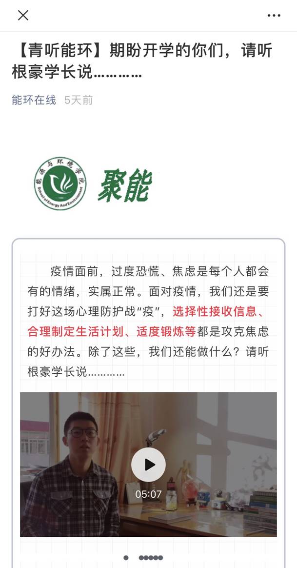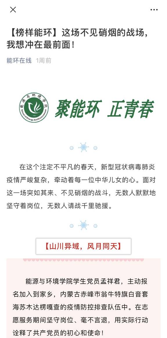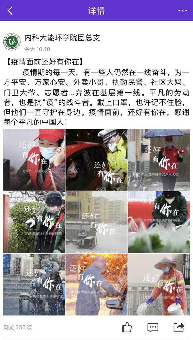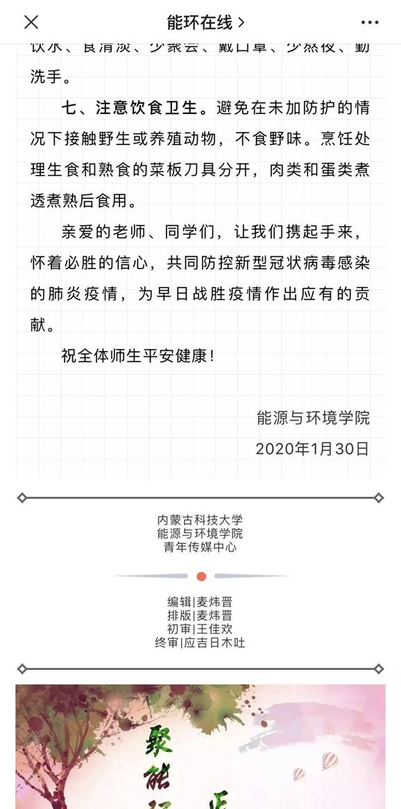公司充分发挥新媒体信息联动、共享优势,全媒体、多平台、多渠道开展疫情防控宣传。通过公司网站、微信公众号、微博、QQ空间、抖音平台等多种方式、多种渠道积极传递正能量,密集推送宣传疫情防护知识、最新疫情消息及公司疫情防疫公告。与此同时,公司在微信公众号《能环在线》中开设 “疫情防控”专栏,发布防控公告、防控手册、防控提示,引导公司师生做好自我防护,科学理性认识疫情,不信谣、不传谣,养成文明健康生活方式。
