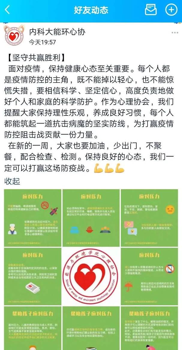 为更好地服务因新冠肺炎疫情情况导致不良情绪的同学,公司组织辅导员开展针对性的心理辅导工作,并组织公司心理健康教育协会及各班心理委员定期为班级同学推送相关的心理健康知识,使同学们能够正确理性认识新冠肺炎、消除内心的恐慌,积极向上的面对这场战“疫”。