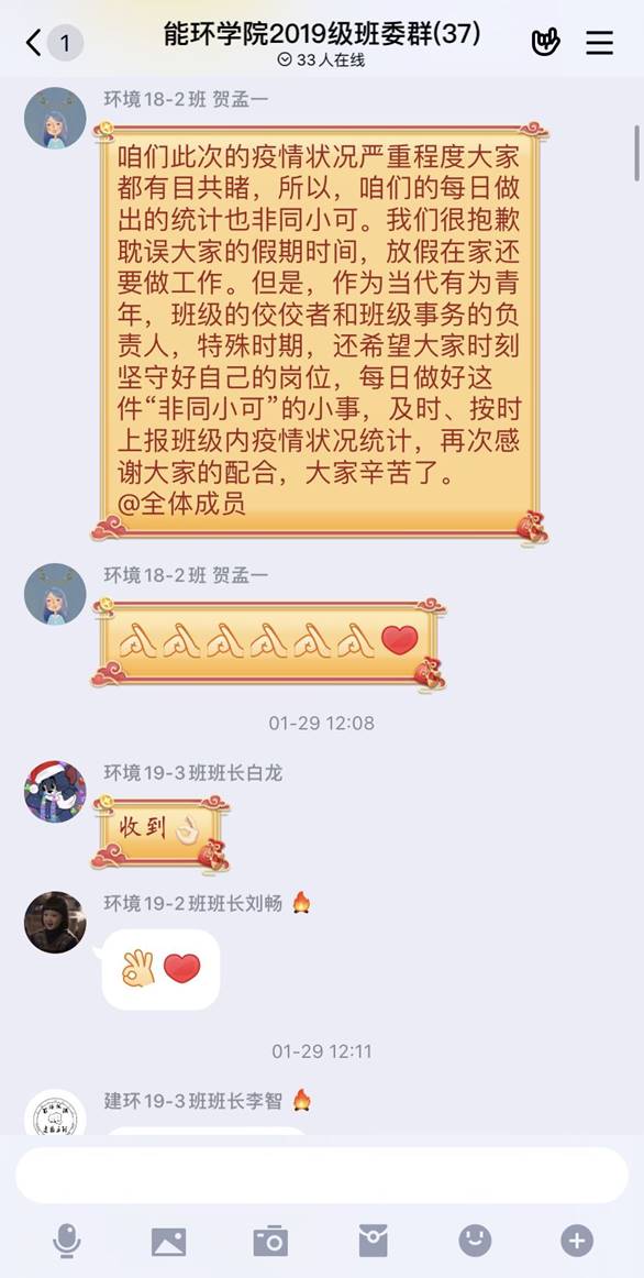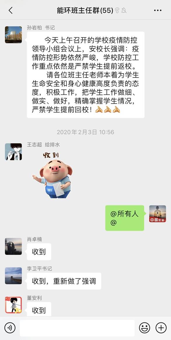 1月26日,按照公司新冠肺炎防控工作会议精神要求,公司成立了《db真人体育官网新冠肺炎疫情防控工作领导小组》,由公司党总支书记李卫平、经理金光任组长,党总支副书记、副经理孙岩柏、副经理张连科任副组长,公司教授委员会委员、各部门负责人、研究生导师、本科生班主任、全体辅导员为主要成员,设立了领导小组办公室,组建了新冠肺炎疫情防控工作群,形成了联动机制,统筹部署,各司其责,确保防控疫情工作科学有序推进。