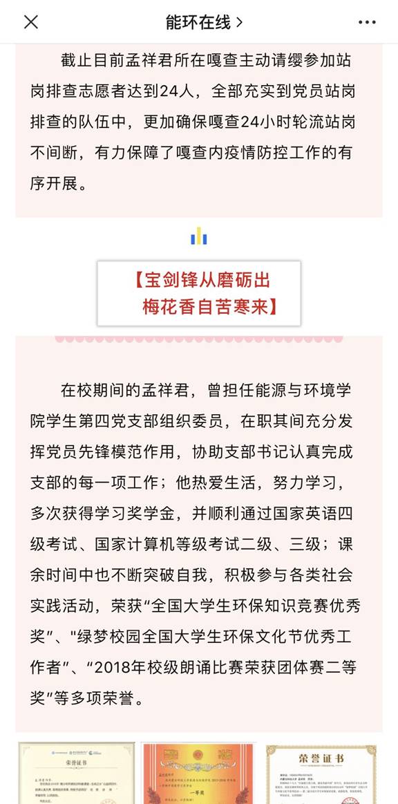 “抗击疫情,责无旁贷,身为青年,勇敢担当”。在疫情防控工作开展以来,公司共有91名青年学子,积极主动参与到防控疫情工作中,用实际行动展现着当代青年的责任和担当。来自能源16-3班员工党员孟祥君就是他们中的一员。他主动报名参加到家乡的疫情防控排查队伍中,在志愿服务期间坚守岗位、毫不言退。在他的影响下,引来了更多的站岗排查志愿者和捐款捐物的爱心人士。他用实际行动诠释了共产党员的初心和使命,用青春最美的姿态踏上抗击疫情的逆行之路。