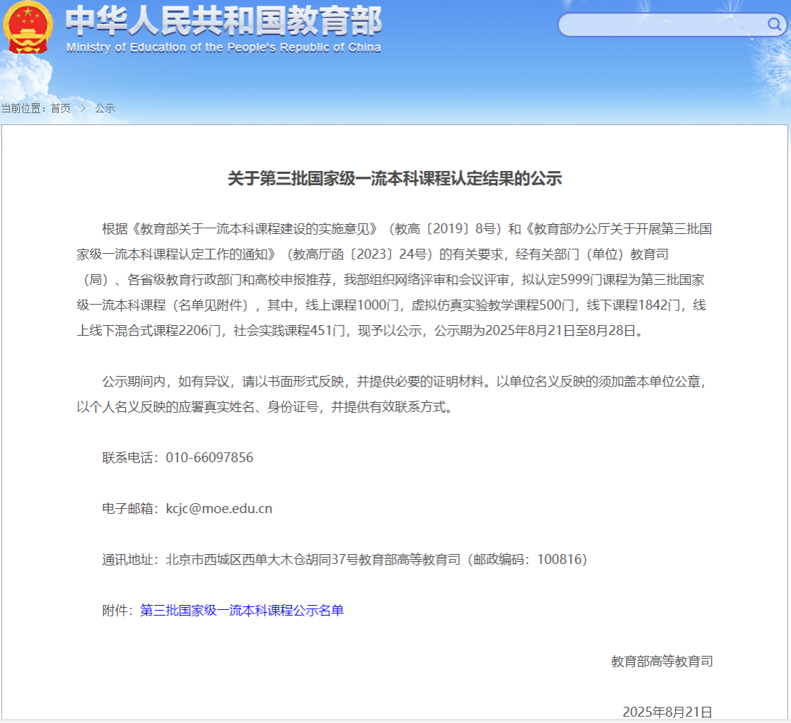 8月21日,教育部公布了《关于第三批国家级一流本科课程认定结果的公示》,公司郑坤灿教授负责的《流体力学A》课程被认定为“国家级线下一流本科课程”,这是公司“十四五”期间在国家级本科课程建设方面取得的重大突破,为公司教学改革和发展注入强劲动力。