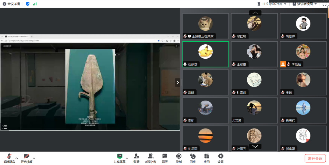 此次活动紧扣山西博物院《大河流金》黄河流域青铜文明特展核心内容,创新采用AR沉浸式参观形式,打破时空限制,让大家线上就能“近距离触摸”青铜瑰宝、感悟黄河文明。活动中,五名入党积极分子提前开展调研,围绕七星纹铜镜、倒钩铜矛等黄河流域代表性青铜文物,生动讲解其背景、工艺与历史内涵,主持人适时补充延伸知识,进一步深化了全体成员的学习体验与认知。活动尾声,支部书记对本次主题活动的成效给予肯定,表扬了五名积极分子的认真准备与精彩讲解,随后向支部全体成员送上诚挚的新年祝福,寄语大家以此次学习为契机,深耕黄河文化、传承文明薪火,立足科研本职、锤炼过硬本领,勇担新时代青年的使命与担当。