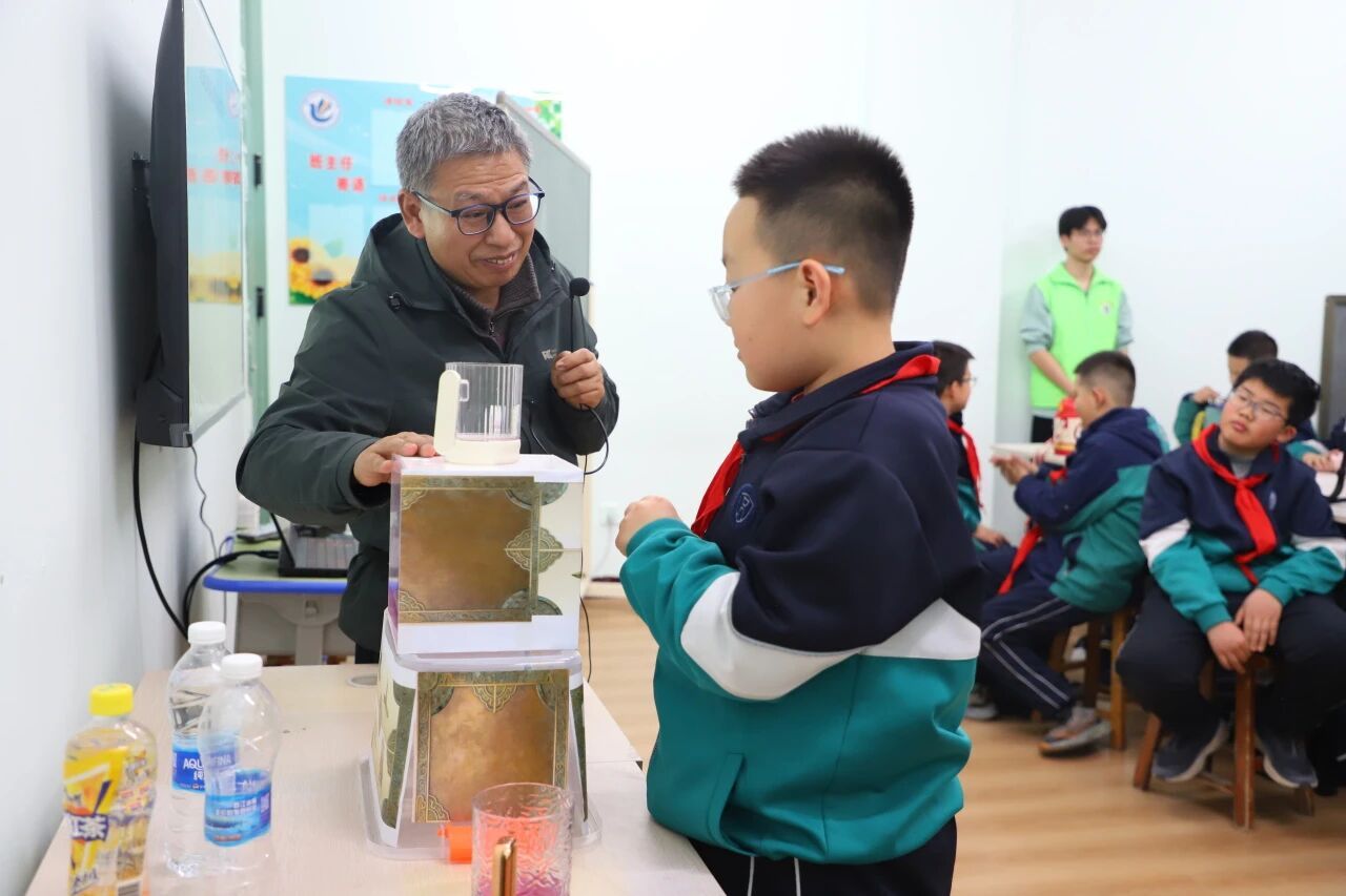 互动环节中,小员工们上台操作,在志愿者指导下体验“公道杯”的原理,在实践中感受流体力学的魅力,在交流中收获物理知识。