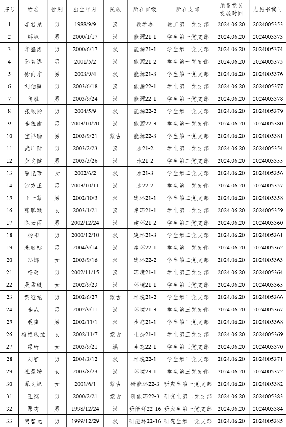经过一年的教育和考察,李君龙、解旭、华盛勇、孙智远、徐向东、刘伯驿、隋凯、张顺畅、李佳鑫、宝祥瑞、武广财、黄文健、曹艳荣、沙方正、王一蒙、张聪颖、陈云雨、杨阳、朱耿标、郑娜、杨政、吴孟璇、黄继龙、李垚、聂奎、格根珠拉、梁琦、刘睿、崔景媛、暴文旭、王继、栗志和贾智元共三十三位同志预备期将满,公司各党支部拟在近期召开党员大会讨论他们的转正问题。为进一步增强发展党员工作的透明度,严格发展党员工作程序,根据《中国共产党章程》和《中国共产党发展党员工作细则》,现将近期拟转正的预备党员情况予以公示。